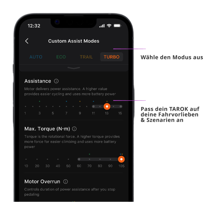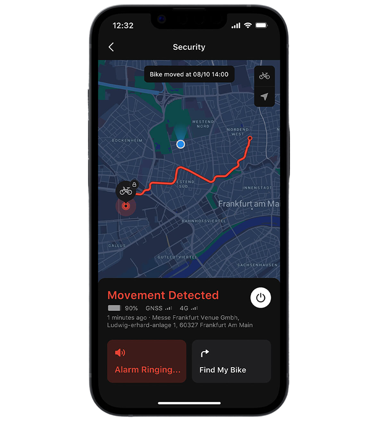 Sicher, vernetzt und immer auf deinem Radar: Passe Drehmoment oder Motor-Overrun per App exakt auf deinen Fahrstil an. Dank integrierter LTE-Anbindung hast du dein TAROK jederzeit im Blick. Digitale Sperre, Echtzeit-GPS und ein akustischer Alarm lassen Langfinger Frust schieben - während du jederzeit weißt, wo dein Bike steht.